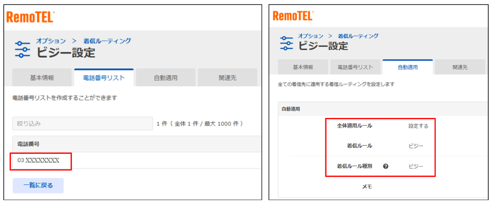 設定1)「ビジー設定」という着信ルーティングを作成し、自動適用にて「03XXXXXXXX」からの着信をビジーになるように設定。