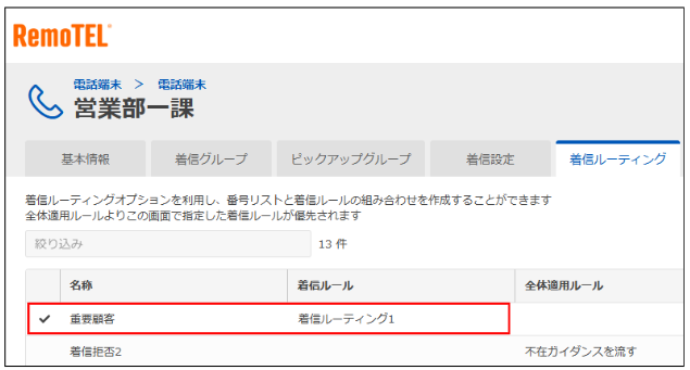 営業部一課にて、着信ルーティングタブから「重要顧客」の着信ルーティングを設定。