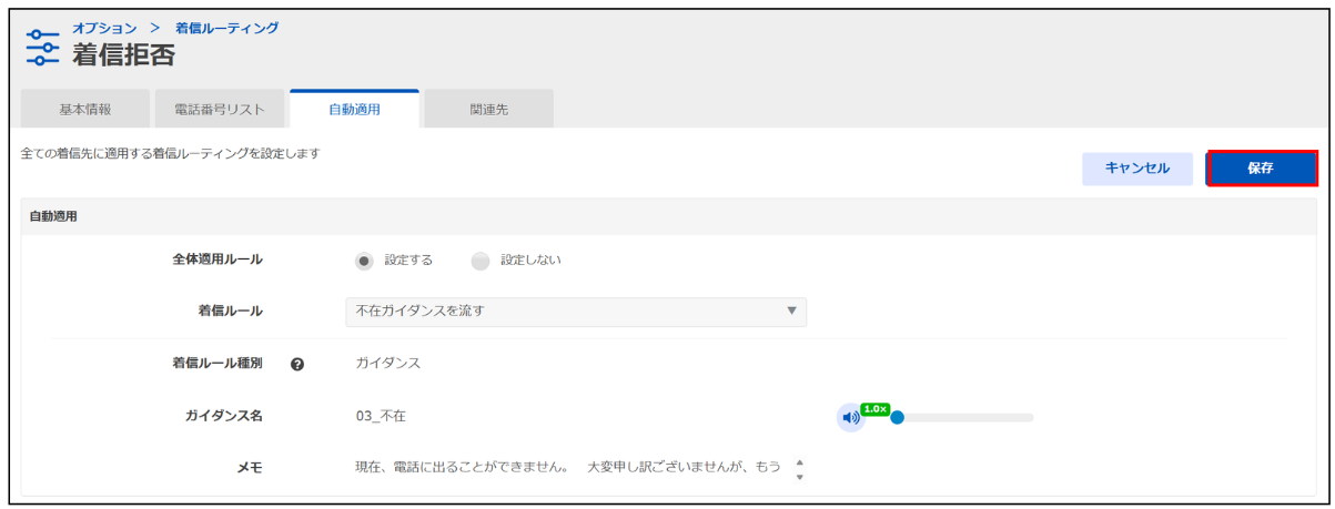 「全体適用ルール」で設定された自動適用の着信ルールを「設定しない」に変更すると、再度「設定する」に変更しても着信ルールは記憶されておらず、再度設定する必要がありますのでご注意ください。