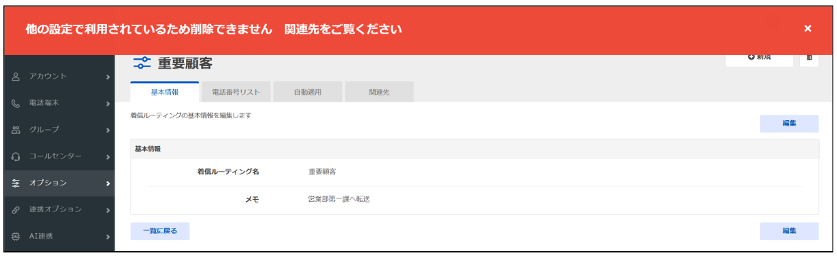 着信ルーティングが関連付いている場合は削除できません。関連先を解除してください。